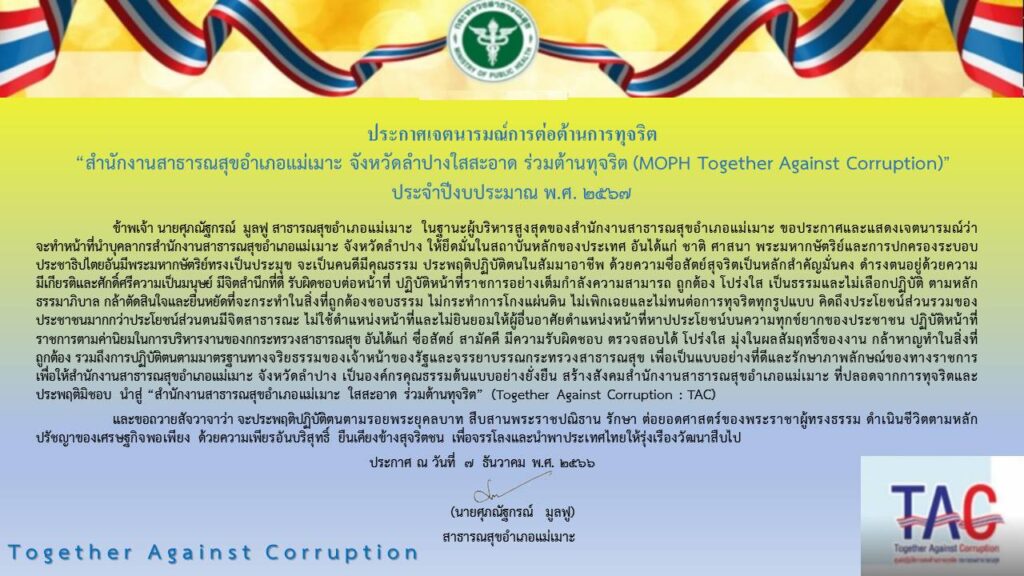 Posted on 12/12/2023Posted in ข่าวประชาสัมพันธ์ ประกาศเจตนารมณ์การต่อต้านการทุจริต “สำนักงานสาธารณสุขอำเภอแม่เมาะ จังหวัดลำปางใสสะอาด ร่วมต้านทุจริต (MOPH Together Against Corruption)” ประจำปีงบประมาณ พ.ศ. ๒๕๖๗ แนะแนวเรื่อง สำนักงานสาธารณสุขอำเภอแม่เมาะ งดการให้และรับของขวัญและของกำนัลทุกชนิดจากการปฏิบัติหน้าที่ (No Gift Policy)ประกาศเจตนารมณ์ การป้องกันและแก้ไขปัญหาการแสวงหาประโยชน์ทางเพศ การคุกคามทางเพศ และการคุกคามทางเพศในการทำงาน ประจำปีงบประมาณ พ.ศ. ๒๕๖๗